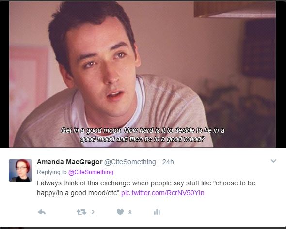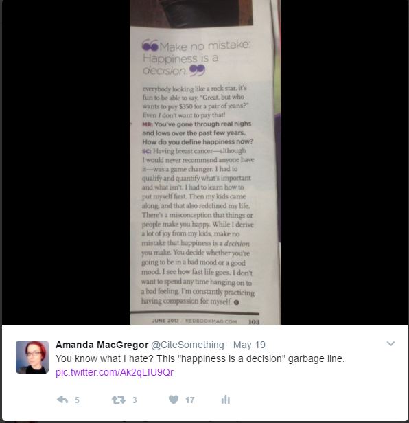 Well, aren’t you superior. You just CHOOSE happiness and calmness. How nice for you. You’re right—I am obviously choosing to be miserable. My alleged “illness” is really just a moral failing. This is just like how people choose to have cancer or any other illness. God, why can’t they just get over it? I am so glad to understand now that I can just decide to be better and BE BETTER. This is revolutionary.