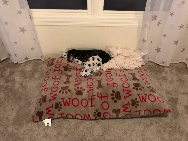 I put this dog bed here because sick little Billy often sits in the middle of the stairs, not sure where he wants to be. I moved it from a spot where usually only Edward uses the dog bed. Clearly he was a bit irritated that I moved HIS bed. No sharing.