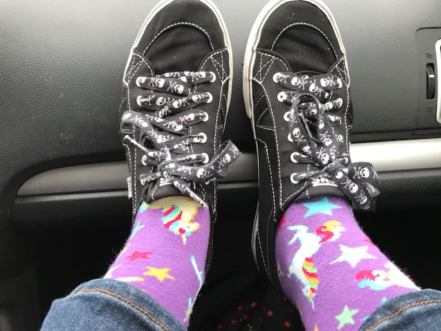 I also finally get to meet Rachel Gold IRL. She approached me and said she was pretty sure I was who she thought, but she’d peeked at my socks during the panel and that solidified her hunch. My brand on Twitter is fun socks, books, mental health, and donuts. Truth in advertising.