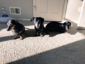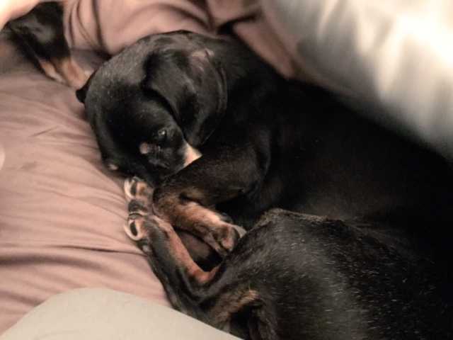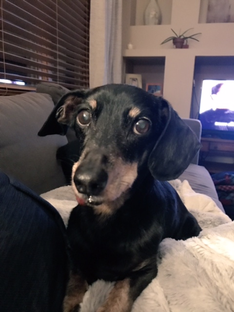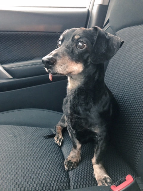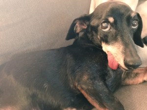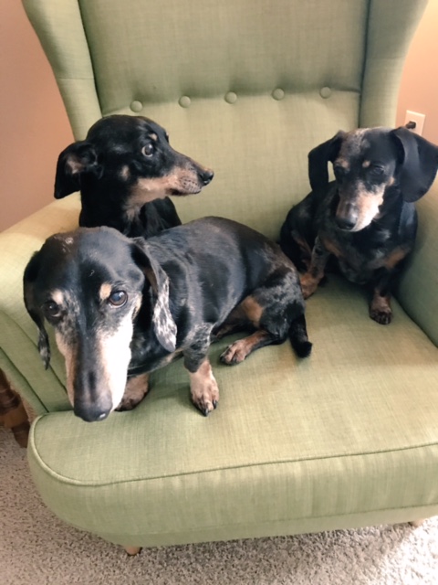 He still sometimes has accidents. He loves to jump on all the tables and desks and has consumed many sips of coffee. He would love for Edward and Billy to play with him, and tugs at their ears to try to start something, but they are weeks away from their 14 birthdays and not really into playing anymore. He’s scared of going in the car, so I try to take him for short errands to help him understand that no one is going to take him somewhere and leave him. Like all the other dachshunds, he loves snuggling my mother. He loves his food, though he’s still not putting on weight, despite our best efforts. His little tail wags almost all day long.