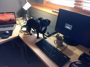 He spends all day curled up in a chair in Matthew’s office. He is lucky that Matthew works from home and can be with him all day. Oscar is very dedicated to his job, spending all day in that office even if Callum and I are also home. If he comes up to my office on the weekend and barks at me for attention, and if I’m busy working, all I have to do is tell him to go to work and he runs down 30+ stairs to Matthew’s office. He doesn’t yet respond to his name, but he knows the command “go to work.”