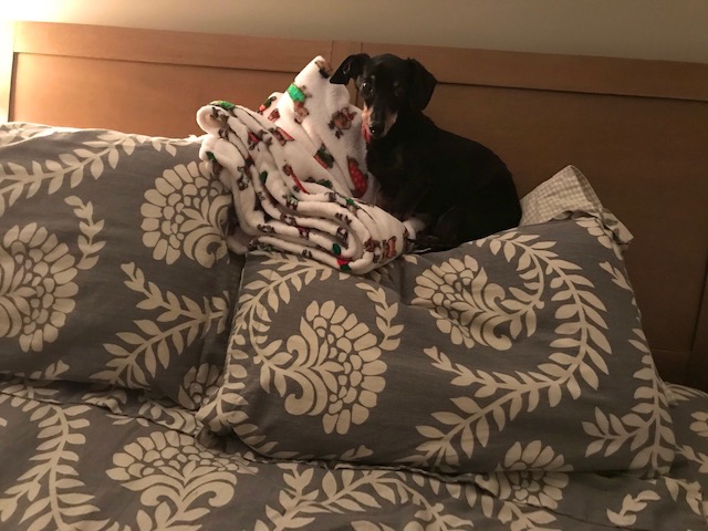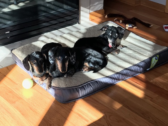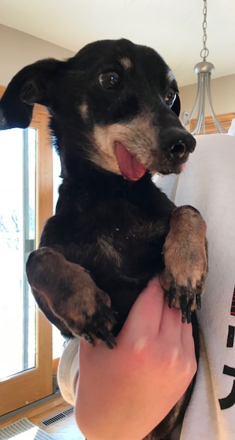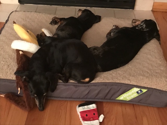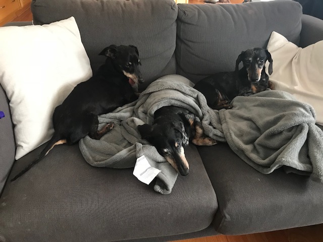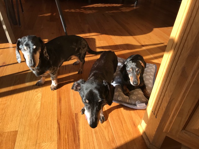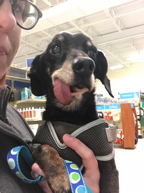 Here at The MacGregor Home for Elderly Dachshunds, we know we will have our hands full as our pack continues to age. The fact that both Edward and Billy will turn 15 next month is amazing. Billy spent much of the past few years battling stomach problems and seeming like he was about to die, but then suddenly seemed to decide, NOPE, I SHALL LIVE. It’s now like he’s aging backwards. He’s down to 8 pounds (from 12 pounds just this past August), playful as heck, and as fierce as ever. Edward can’t hear, can currently hardly see, and has a history of seizures. And Oscar… well, he’s an adorable little disaster. He has no teeth, has basically recovered from last spring’s paralysis, has a heart murmur, and has been through some shit in his life. We have baby gates blocking all rooms without doors. I have a subscription order for potty pads. Two of the three dogs need prescription food. We have dog diapers, dog strollers, and use our steam cleaner a lot. A LOT. I cry over them and swear at them and desperately love them. I don’t know what I will do when they break our DOGS LIVE FOREVER pact. But for now, I’m just grateful that Edward seems to be rebounding from this setback.