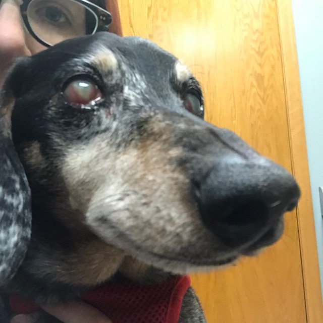 As the redness got worse, we took him to the vet. They did a funky little test on him that basically turned his tears neon green, then they examined his eyes with some kind of special light/tool. Nothing odd showed up, so they sent us home with an ointment. We repeated this process two more times as his eyes became increasingly weird. They went from red, to milky/cloudy, to ZOMBIE EYEBALLS.