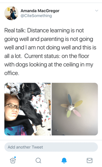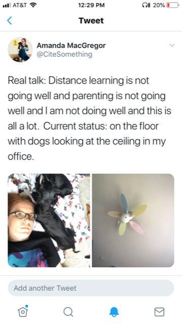 So yes, I’m grateful I get to stay home this year. I’m grateful we have resources and safety nets and all the blah blah positive things. I never for one second forget how many people don’t have these choices, these resources. But I am still allowed to say that this sucks. That I didn’t want to have to choose to leave my job. That I didn’t want to have to choose to teach my child 9th grade. That just dealing with my regular old crappy brain issues would be plenty but now they’re amplified by everything. This all sucks.