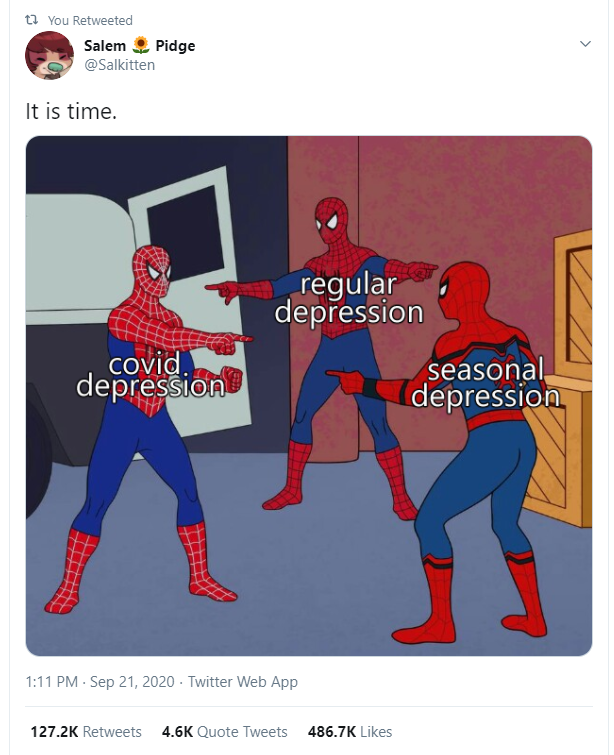 Have you seen that meme of the Spidermans (Spidermen?) as seasonal depression, regular depression, and COVID depression? Here, I’ll spare you googling:
