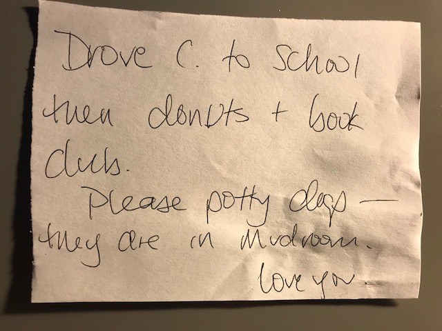 Writes note to husband before work. Quickly adds “love you” because suddenly I’m certain I will of course die while driving today and I don’t want my last words ever to him to be that the dogs need to pee.